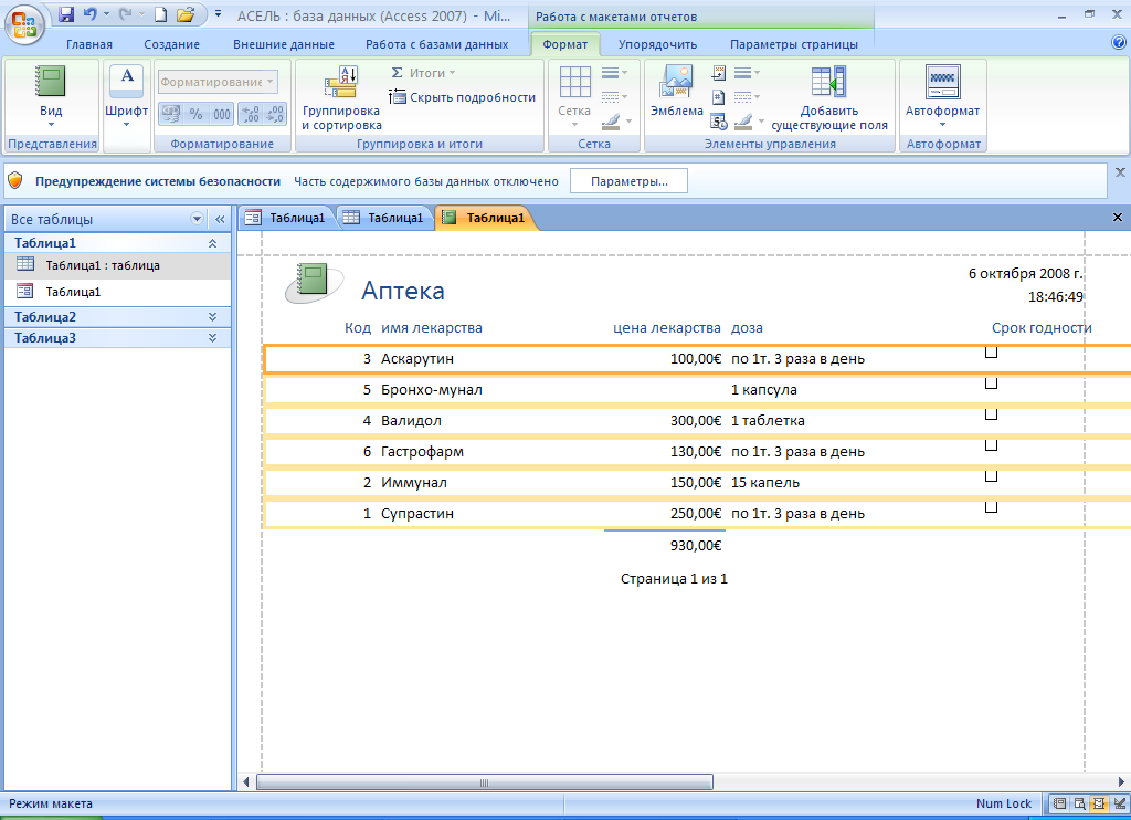 Инструментальные средства Microsoft Office Access 2007 обеспечивают создание отчетов практически любой степени сложности. Структура отчета может быть как очень простой (обычный список), так и очень сложной — сводный отчет о продажах, сгруппированный по различным областям.