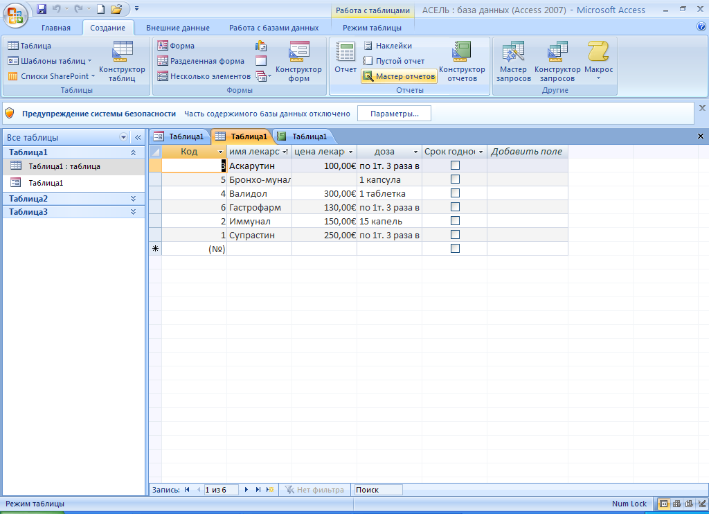 1. Перейдите на вкладку Создание, затем в группе Отчеты щелкните на пиктограмме Мастер отчетов.