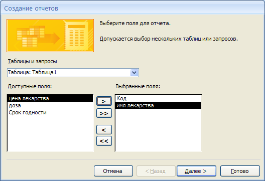 Рис. 23. Выберите таблицу, на основе которой создается отчет, а также поля, которые будут включены в отчет.