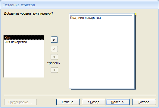 3. В следующем окне выбираются уровни группировки в отчете (рис. 24.), щелкните на кнопке Далее