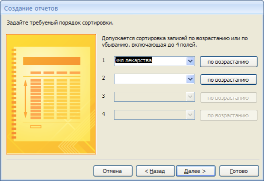 Рис. 25. Определение порядка сортировки полей, выводимых отчетом