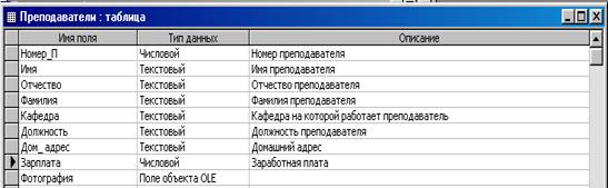 Заполним описания полей для таблицы " Преподаватели" данными таблицы1: