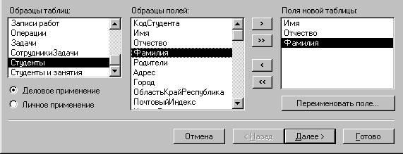 Для включения поля в нашу таблицу необходимо выбрать это поле в списке и щелкнуть на кнопке ">". Для переноса всех полей используется кнопка ">>"Выберем шаблон таблицы "Студенты", в нем выберем и перенесем поля: "Фамилия", "Имя", "Отчество", "Факультет", "Адрес", "Заметки". Нажмем кнопку "Далее".