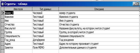 Нажмем кнопку "Готово" для завершения создания таблицы "Студенты". Откроется окно конструктора таблиц, в котором введем дополнительные поля приведенные в Таблице2 и введем новые размеры полей.