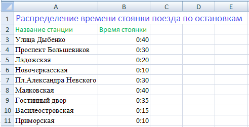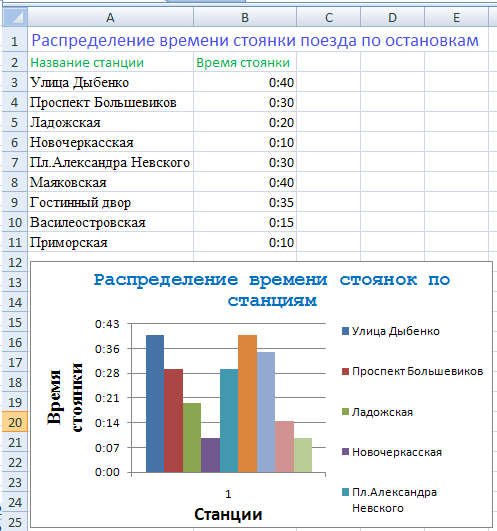2. Создайте столбчатую диаграмму распределения времени стоянки по станциям. Для этого выполните следующие действия: