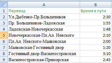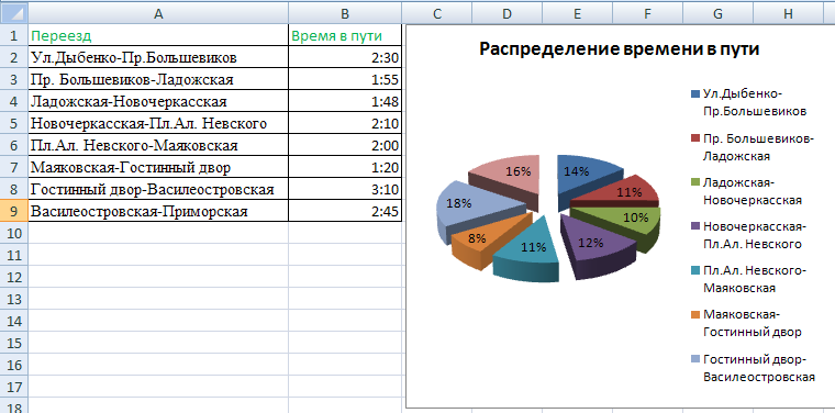 2. Создайте круглую объемную диаграмму распределения времени в пути. Для этого:
