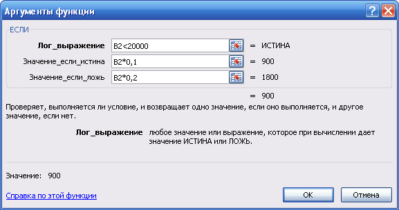 3. Для расчетов комиссионных по первому правилу в ячейку С2 введите формулу =ЕСЛИ(В2<20000;В2*0,1;B2*0,2). Для этого: