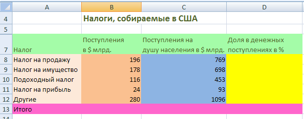 3. Ввести в D8 формулу для вычисления доли подоходного налога в общей сумме налогов: B8*100/$B$13.
