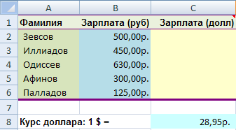 2. Протяните формулу так, чтобы были автоматически вставлены формулы для выражения в долларах всех остальных сумм в таблице