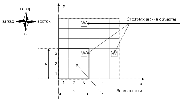 Для космической съемки используется специальный фотоаппарат высокого разрешения, установленный на космическом спутнике. Фотоаппарат может делать снимки квадратных участков земной поверхности размером k × k километров. Исходно аппарат наведен на юго-западный угол заданной области, то есть, если сделать снимок, на нем будут видны единичные квадраты с координатами x и y от 1 до k километров.