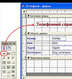 Раздвиньте с помощью мыши область заголовка формы, добавьте в заголовок элемент "Надпись", введите туда текст "Телефонный справочник", укажите желаемые параметры текста (шрифт, размер, цвет и т.п.). Аналогичным образом оформите и примечание формы. Введите туда свое имя (как автора базы данных), год создания базы данных или аналогичную информацию.
