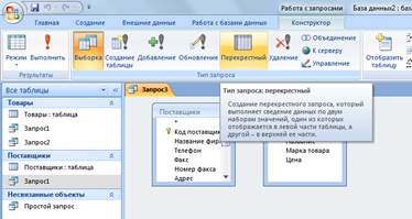 5. «Запрос1:запрос на выборку»диалогтық терезесінде тізімдермен байланысқан «Поставщики» және «Товары» кестелері пайда болады.