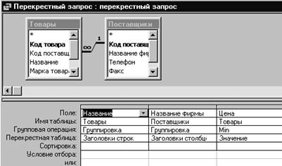 6. Констурктор вкладкасынан Тип запроса—Перекрестныйкомандасын таңдау. Запростың «Вывод на экран»жолы запростың бланксінде «Перекрестная таблица»жаңа жолға ауысады. Оның алдына «Групповая операция»жолы пайда болады.