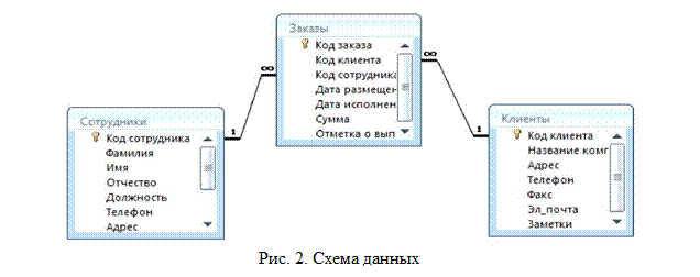 29. В результате должна получиться схема данных, представленная на рис. 2. В приведенном примере используются связи «один-ко-многим». На схеме данных они отображаются в виде соединительных линий со специальными значками около таблиц. Связь «один-ко-многим» помечается «1» вблизи главной таблицы (имеющей первичный ключ) и «∞» вблизи подчиненной таблицы (имеющей внешний ключ). Связь «один-к-одному» помечается двумя «1» (оба поля таблиц имеют первичные ключи). Неопределенная связь не имеет никаких знаков. Если установлено объединение, то его направление отмечается стрелкой на конце соединительной линии (ни одно из объединенных полей не является ключевым и не имеет уникального индекса).