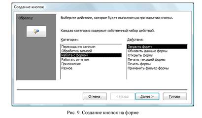 10. В категории Работа с формой выберите действие Закрытие формы и нажмите кнопку Далее. Выберите рисунок или текст, который будет размещаться на кнопке.