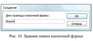 26. В диалоговом окне Создание (рис. 10) введите имя новой кнопочной формы и нажмите ОК.