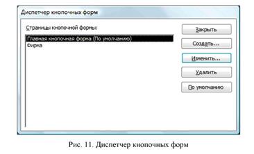 27. Имя новой кнопочной формы добавится в список Страницы кнопочной формы окна Диспетчер кнопочных форм (рис. 11).