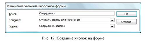 29. В диалоговом окне Изменение страницы кнопочной формы щелкните по кнопке Создать. Появится диалоговое окно Изменение элемента кнопочной формы (рис. 12).