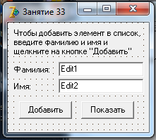 Следующая программа (ее текст приведен ниже) формирует список студентов, добавляя фамилии в начало списка. Данные вводятся в поля редактирования диалогового окна программы (рис. 3) и добавляются в список нажатием кнопкиДобавить(Button1).