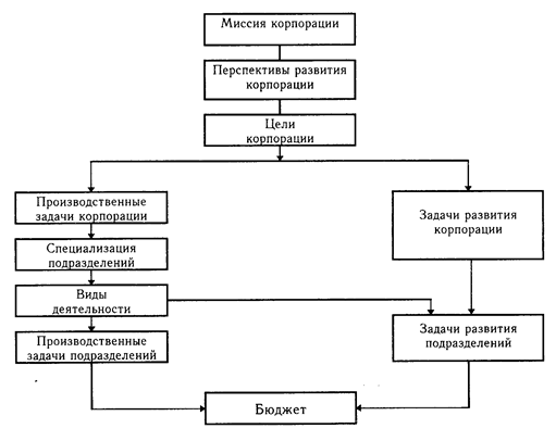 Представляется важным, чтобы процесс планирования в полной мере был последовательным, а планы развития подразделений полностью отражали бы цели корпорации. Для этого планы необходимо периодически и последовательно пересматривать. Управляющие и другие сотрудники должны иметь адекватную подготовку по вопросам выполнения задач. Простота и легкость исполнения - не менее значимые факторы. В плане должно быть представлено лишь такое количество задач, которое поддается контролю и управлению. Процедуры учета должны быть четко определены. Что касается процесса планирования, то он должен быть полностью связан с процессом составления бюджета организации. На приведенном ниже рисунке изображен процесс планирования в рамках подразделения и его взаимосвязь с целями и задачами корпорации.