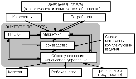 Эти две ступени в иерархии управления жестко связаны между собой диалектическим единством внешней и внутренней сред фирмы. Внешняя среда фирмы выступает как нечто заданное. Ее составляют: