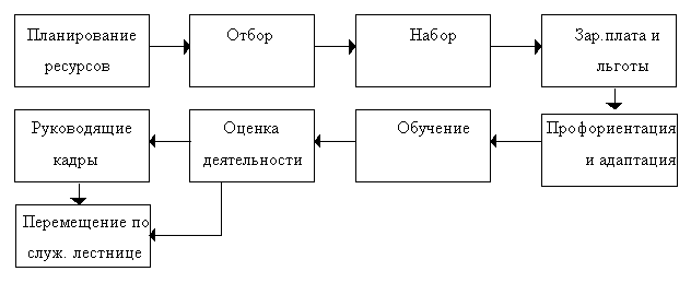 Набор персонала (отбор кандидатов). Этот этап предполагает создание резервов потенциальных кандидатов на все имеющиеся должности, и, в последующем, отбор наиболее подходящих людей на эти должности. Набор проводится в соответствии с будущими потребностями в трудовых ресурсах, здесь учитывается количество имеющейся в наличии рабочей силы, текучесть, увольнения, выход на пенсию и т.п. Набор производится с помощью объявлений, или при участии агентств по трудоустройству. Также набор можно проводить внутри организации с помощью продвижения своих сотрудников по служебной лестнице (планированию карьеры).