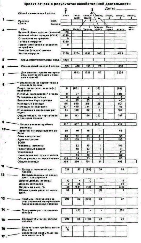 В первые годы после приватизации завода мы делали прогноз по отчету о хозяйственной деятельности нашего предприятия прямо на доске в конференц-зале. Бывало, я стоял у доски и записывал цифры, которые сообщали мне из зала. Потом мы подводили итог и смотрели, насколько мы приблизились к плановому заданию по доналоговой прибыли. Мы до сих пор используем этот основной подход, но только теперь у нас на руках отпечатанные карточки, которые мы время от времени видоизменяем по мере того, как изменяется сама компания и у нас появляются новые идеи по поводу разных усовершенствований. Вы видите последнюю версию такой карточки.