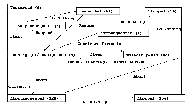 Класс ThreadState определяет набор всех возможных состояний выполнения для потока. После создания потока и до завершения он находится по крайней мере в одном из состояний. Потоки, созданные в общеязыковой среде выполнения, изначально находятся в состоянии Unstarted, в то время как внешние потоки, приходящие в среду выполнения, находятся уже в состоянии Running. Потоки с состоянием Unstarted переходят в состояние Running при вызове метода Start. Не все комбинации значений ThreadState являются допустимыми; например, поток не может быть одновременно в состояниях Aborted и Unstarted.
