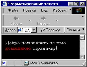 <html> <head> <title>Форматирование текста </title> </head> <body text="#ffffff" bgcolor="#000000"> Добро пожаловать на мою <br> <font color="#CC0000">домашнюю