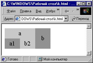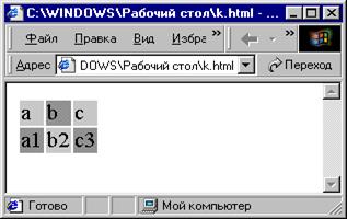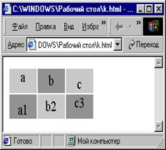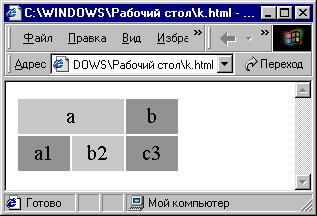В этом примере использовался параметр colspan=2, прописав его для ячейки «а» Ячейки «с» нет, т.к. ячейка «а» равна по длине двум ячейкам (что указано параметром colspan). Для избавления от пространства между ячейками таблицы используется атрибут cellspacing.
