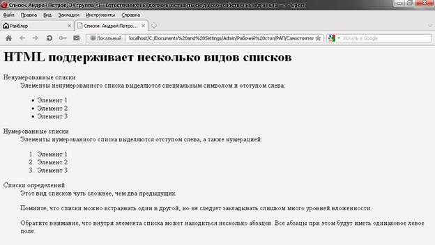 Наши знания о списках можно вкратце свести в пример, который нужно сохранить под именем «Виды списков.html»: