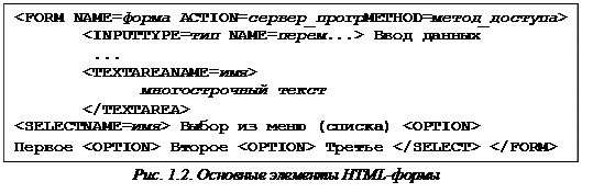 Основными элементами формы являются элемент ввода INPUT, многострочная область текста TEXTAREA и меню SELECT (рисунок 1.2).