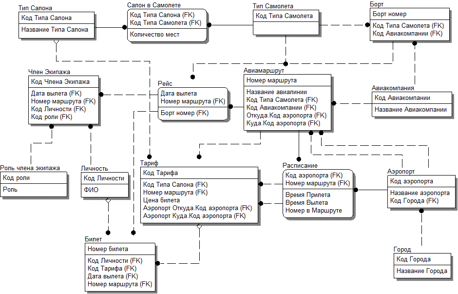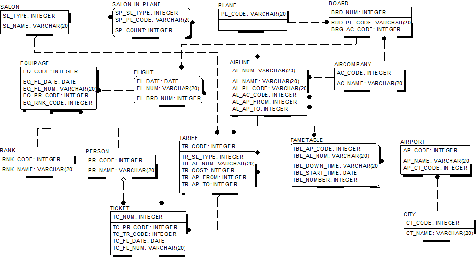 Перед изучением языка SQL необходимо рассмотреть тестовую базу данных на которой будут отрабатываться все запросы. Наша тестовая база данных полностью соответствует рассмотренной в учебном пособии по нормализации данных и создании базы данных. Напоминаю, что эта база данных описывает сферу воздушных перевозок. Все пояснения к модели даны в пособии по нормализации данных и создании базы данных