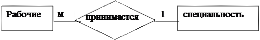 Между сущностями рабочие и специальности степень связи один со многими (М:1) (рисунок 1.3), т.к. один рабочий принимается на одну специальность, а одну специальность может иметь множество рабочих.