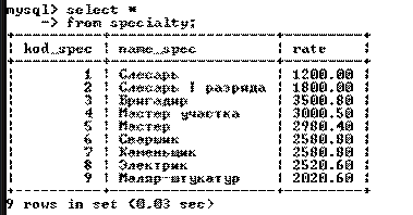 Например: из таблицы Специальность (specialty) (рисунок 7.1) выбрать все записи, поле ставка (rate) которых больше или равна 2200. Результат выполнения запроса отображен на рисунке 7.2