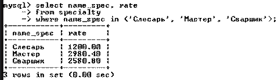 Пусть необходимо выбрать специальности слесарь, сварщик или мастер и их ставки (rate) из таблицы Специальность (specialty). Исходная таблица Специальность (specialty) отображена на рисунке 7.3. Результат выполнения запроса отображен на рисунке 7.8.