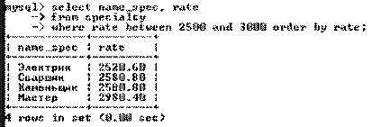 Пусть требуется извлечь из таблицы специальности (specialty) записи, соответствующие названиям специальностей (name_spec), ставки (rate) которых от 2500 до 3000, с сортировкой по полю ставки (rate). Результат выполнения запроса отображен на рисунке 8.3