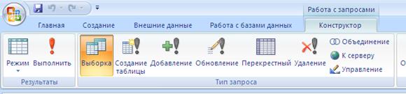 Тип запроса-действия выбирают на линейке инструментов Конструктор (рисунок 1) в группе Тип запроса. Можно всегда изменить тип запроса в окне конструктора запроса.