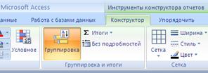 Отчеты предоставляют возможность группировать выводимую информацию. Для этого используются инструменты группы Группировка и итоги (рисунок 5).В этом окнеможно определить до 10 полей или выражений, которые будут использоваться в отчете для группировки данных. Первый элемент списка определяет основную группу, а последующие подгруппы внутри групп.