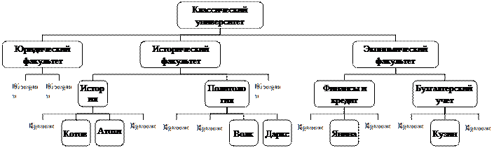 1. Будущая структура базы данных должна отражать организационную структуру университета. Эта структура представлена на рис. 4. Структура университета имеет иерархический тип: в университете множество факультетов; на каждом факультете несколько специальностей, по каждой специальности учится множество студентов (а во время вступительных экзаменов поступает множество абитуриентов). Два верхних уровня этой иерархии — факультеты и специальности. Спланируем две таблицы, которые войдут в базу данных, указав названия таблиц и имена полей: