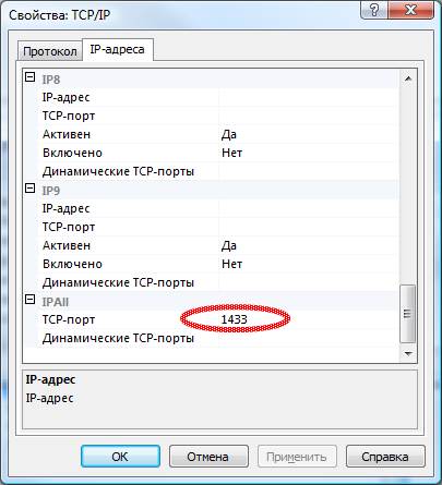 Откройте вкладку «IP-адреса» и настройте параметры. Ключевым моментом является установка TCP-порта 1433 у всех IP-адресов.