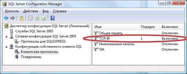 Далее переходим к конфигурированию собственного клиента SQL. Необходимо выбрать «Клиентские протоколы». Ключевым моментом является включение TCP/IP протокола.