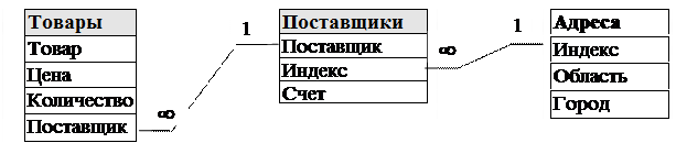 Таким образом, в нашей БД «Поставки товаров», состоящей из таблиц «Товары», «Поставщики» и «Адреса», необходимо организовать следующие межтабличные связи (ниже мы используем схематичное изображение межтабличных связей, совпадающее с представлением схемы связей в СУБД Access, работа в которой будет рассматриваться в последующих разделах пособия, здесь символ ¥ соответствует термину ко-многим):