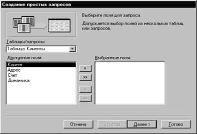 Выбрав в окне Таблицы/запросы нужную таблицу, можно отобрать в ней для просмотра нужные поля, нажав после выбора мышью соответствующего поля таблицы в окне Доступные поля кнопку правее окна «>», либо сразу все поля таблицы, нажав кнопку «>>». Если же необходимо отобрать для просмотра поля сразу из нескольких связанных между собой таблиц, то после выбора полей из первой таблицы переходят в окне Таблицы/запросы к другой таблице и аналогичным образом добавляют нужные для просмотра поля.