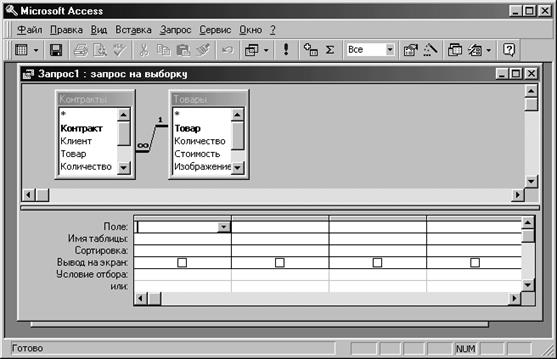 Для создания запроса в режиме Конструктор после выбора таблиц для запроса в окне Добавление таблицы щелчком мыши по кнопке Добавить (см. рис. 15) на экране появляется диалоговое окно Запрос на выборку, состоящее из двух частей (см. рис. 16): верхней, где представлены таблицы, на основе которых строится запрос, и нижней, где выбираются поля из таблиц и где, собственно говоря, непосредственно формируется запрос.