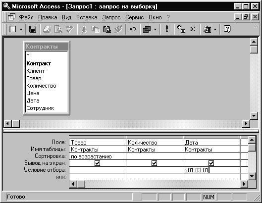 Составим теперь список контрактов, заключенных с клиентами после 1 марта 2001 года. Для подготовки такого запроса с условием для выборки записей, действуя аналогичным предыдущему случаю образом, выберите в главном окне БД объект Запросы и выполните затем последовательно команды Создать/Конструктор. В окно Запрос на выборку добавьте таблицу «Контракты», перенесите мышью из списка полей выбранной таблицы в область спецификации запроса поля таблицы «Товар», «Количество» и «Дата» в нужной последовательности.