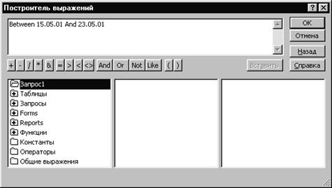 В качестве примера отбора данных по более сложному условию рассмотрим запрос на получение сведений о контрактах, заключенных клиентами за определенный промежуток времени, например с 15.03.01 по 23.05.01.