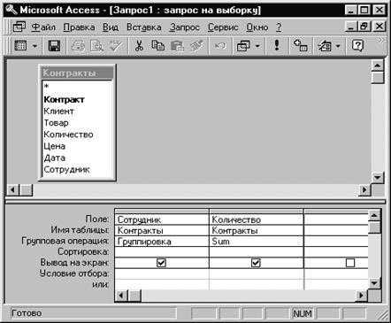 В результате выполнения запроса будут сгруппированы записи с одинаковыми фамилиями сотрудников и просуммированы соответствующие количества товаров, на которые были заключены контракты этими сотрудниками. Сохраните запрос под именем «Контракты сотрудников».