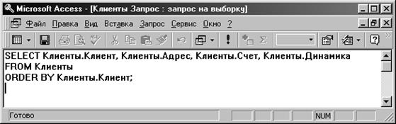 Например, после перехода к режиму SQL ранее сформированный мастером Простых запросов запрос «Клиенты» будет выглядеть так, как это показано на рис. 25. Как видно, текст SQL программы запроса достаточно прост и вполне доступен для понимания с первого раза. В первой строке после оператора SELECT (выбрать, англ.) указываются поля таблицы «Клиенты», которые выбраны для запроса. Во второй строке после оператора FROM (из, англ.) указывается таблица, из которой эти поля выбираются, а в третьей строке после оператора ORDER BY (упорядочить по, англ.) указано поле, по которому проводится сортировка результирующих записей.