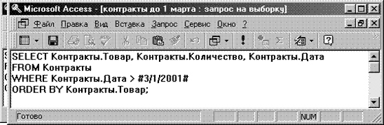 Запрос с заданным критерием отбора записей «Контракты после 1 марта», в котором производится выборка по условию, имеет программу с аналогичной структурой. Однако в программу запроса (см. рис. 26) добавлена строка с условием, которое сформировано после оператора WHERE (где, англ.) и по которому из таблицы «Контракты» выбираются все записи с контрактами, заключенными после 1 марта 2001 года.